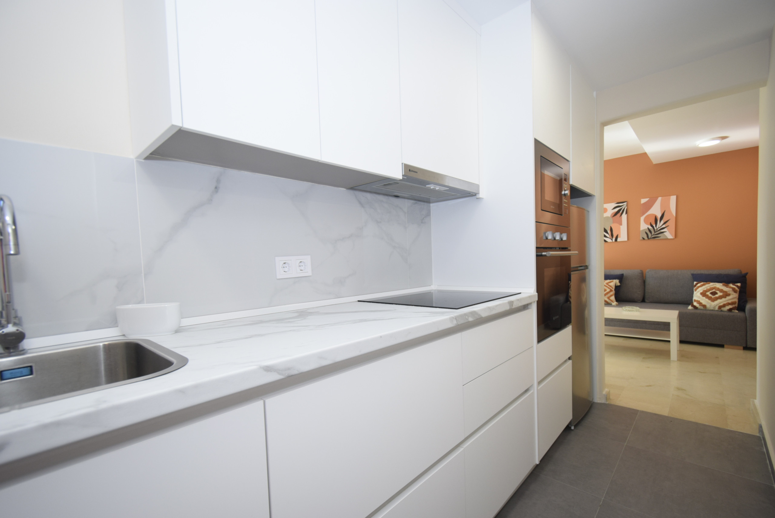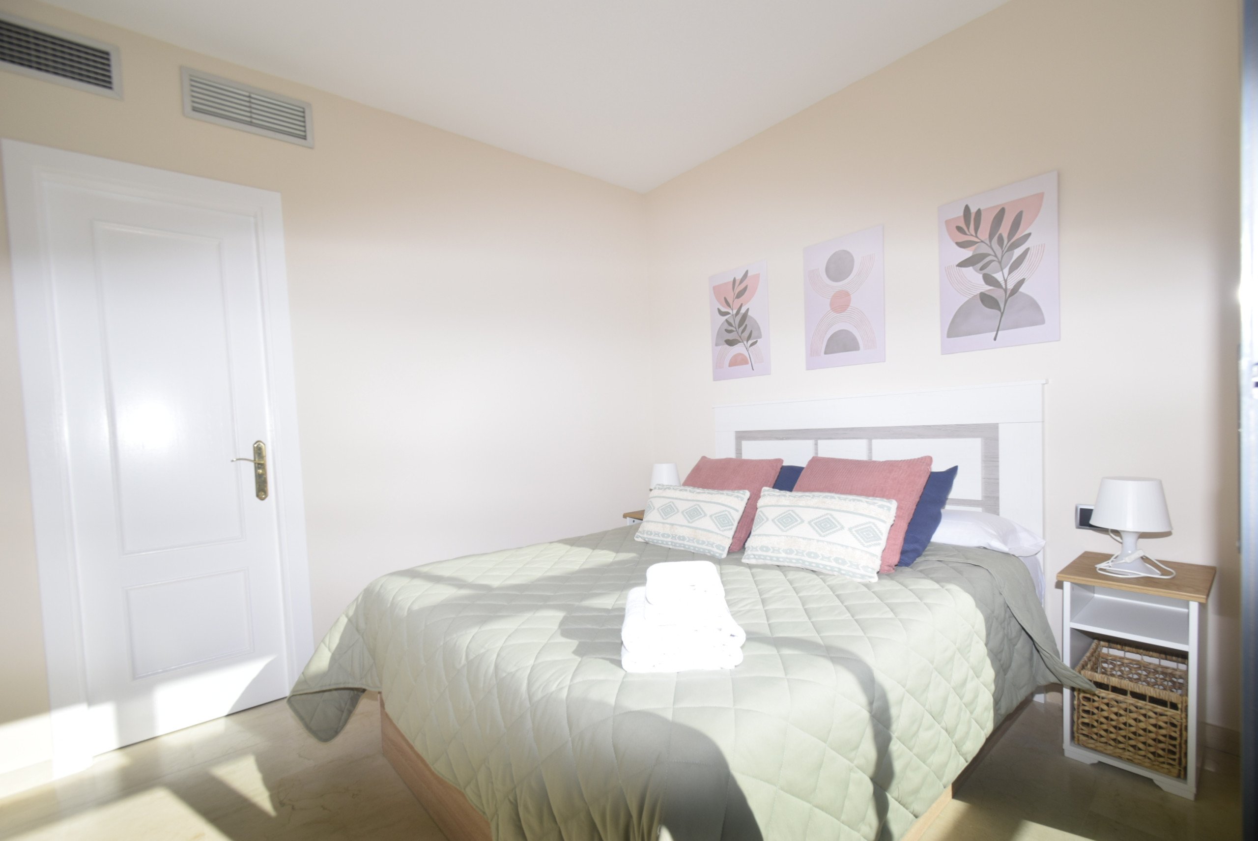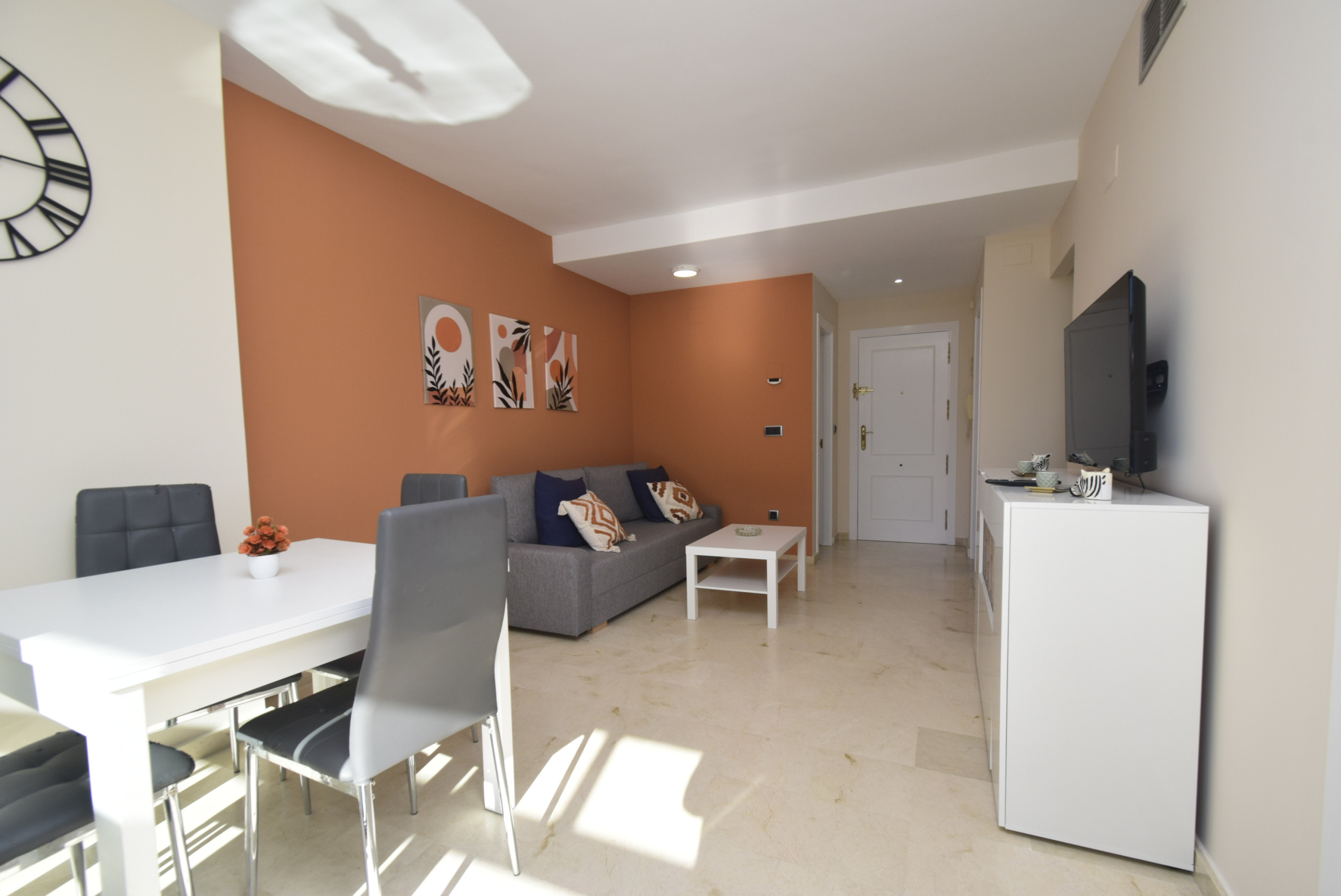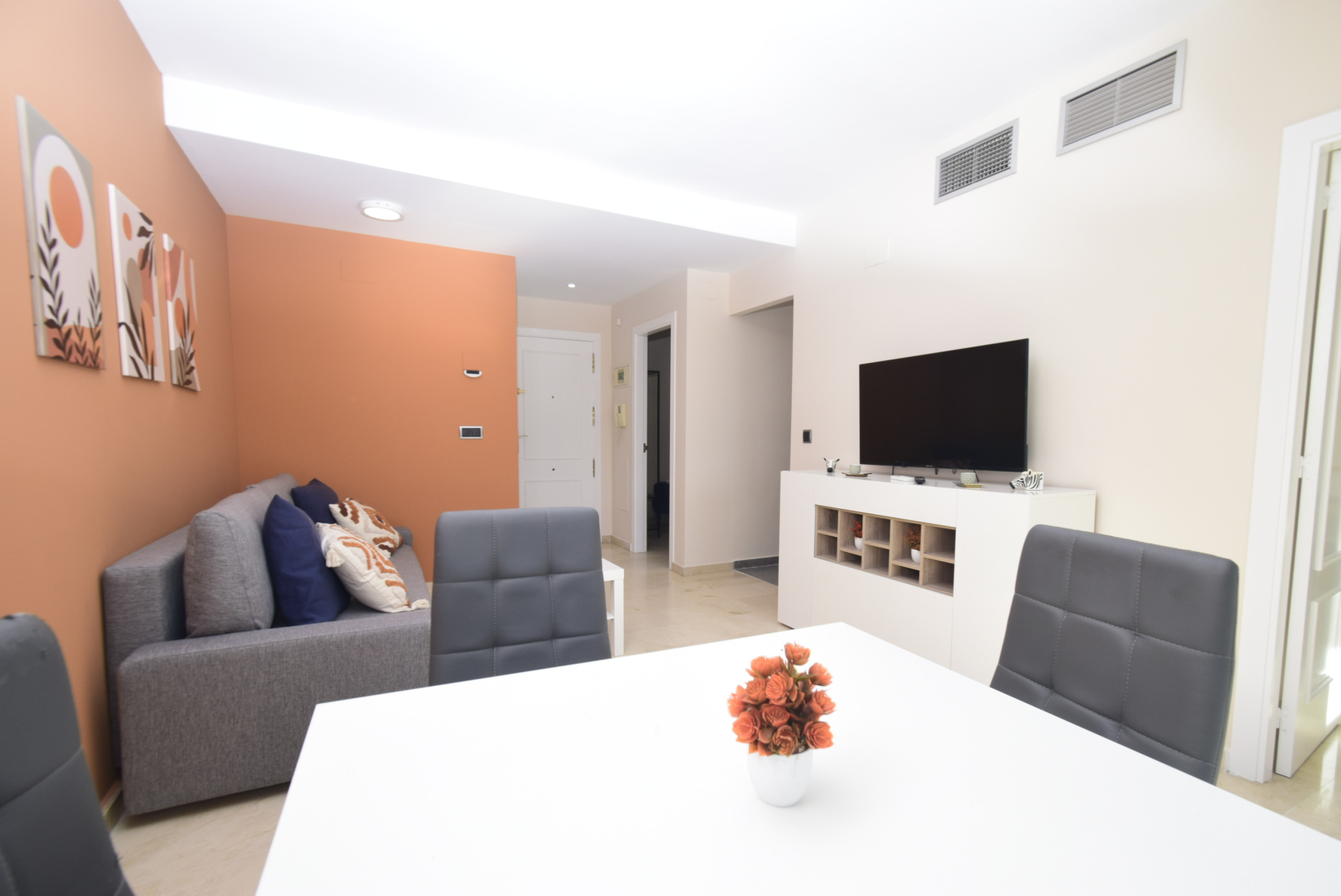 Dispone de ascensor, terraza, plancha, caja fuerte (en alquiler), calefacción bomba de calor, aire acondicionado solo en salón (servicio opcinal), parking comunitario (sin plaza garantizada) sal aire libre en mismo edificio, 1 Televisor.